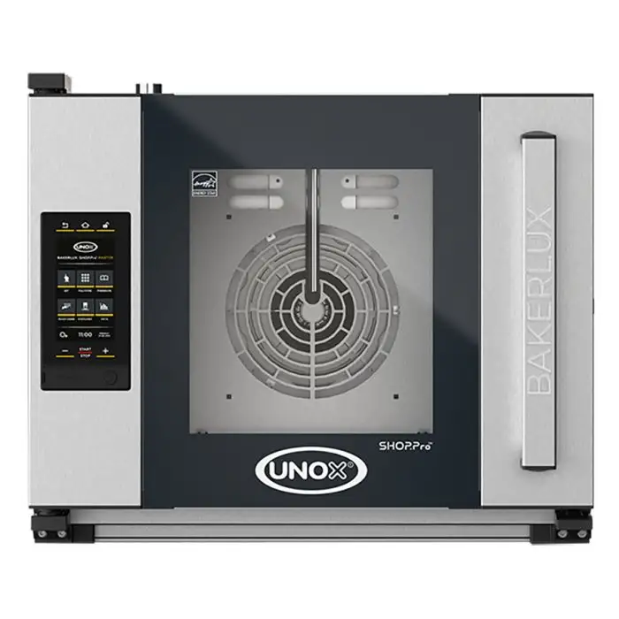 FORNI ELETTRICI A CONVEZIONE CON UMIDIFICAZIONE UNOX. BAKERLUX SHOP.Pro™ è la gamma di forni per la doratura di prodotti congelati studiata per gli spazi commerciali, dove i ritmi sono serrati ed i volumi di cottura sono elevati. Nasce dalla sintesi di anni di esperienza e di ricerca di UNOX nei piccoli negozi, nei supermercati e nelle catena fast food. Ogni forno garantisce prestazioni di alto livello a qualsiasi condizione lavorativa, sfruttando le più avanzate ed intuitive tecnologie intelligenti per dare un supporto concreto al team di lavoro. Adatto per panetteria e pasticceria. Camera di cottura in acciaio inossidabile 304. Apertura porta automatica a fine ciclo cottura. Serratura elettrica. Maniglia ergonomica con pennino integrato per nominare i programmi salvati nella memoria del forno. Cottura a convezione + Umidità con temperatura variabile da 48°C a 260°C. Illuminazione a Led integrata nella porta. Doppio vetro. Supporti teglia in acciaio cromato con antiribaltamento. Ventole simmetriche ad inversione di marcia: permettono di distribuire l'aria in modo uniforme su ogni teglia. Pannello di controllo touch screen con display LCD da 5": dotato di programmi di cottura automatici CHEFUNOX, tecnologia MULTI.Time che permette di cuocere fino a 10 referenze contemporaneamente e funzione READY.Bake per un utilizzo immediato per i meno esperti. Umidità in Percentuale 0-20–40–60–80–100%. Tecnologia ADAPTIVE.COOKING: riconosce la qualità del cibo infornata regolando automaticamente il programma di cottura. Tecnologia AUTO.SOFT: gestisce i flussi di aria calda per evitare disuniformità. Tecnologia SMART.PREHEATING: tiene conto delle precedenti cotture effettuate e regola automaticamente la perfetta temperatura di pre-riscaldamento per il programma di cottura successivo, eventualmente anche raffreddando la camera di cottura se si trovava ad una temperatura più elevata. Funzionamento continuo "INF". Capacità n. 4 teglie/griglie cm 46 x 33 (teglie non incluse).